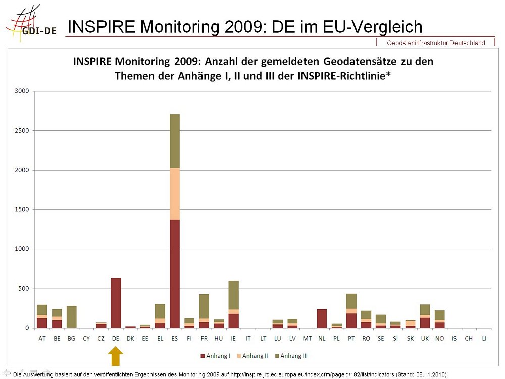 Auch innerhalb Deutschlands ist das Bild der gemeldeten Datensätze sehr uneinheitlich. In einigen Bundesländern hat eine doppelte Meldung von Datensätzen z.B. auf Bund- und Länder-Ebene, sowie auf Land- und kommunaler Ebene stattgefunden. Aus diesem Grund werden derzeit Prüfkriterien von der Koordinierungsstelle GDI-DE erarbeitet, mit Hilfe derer das Monitoring von 2010 hinsichtlich Plausibilität, Flächendeckung und Redundanz der Meldungen verbessert wird.